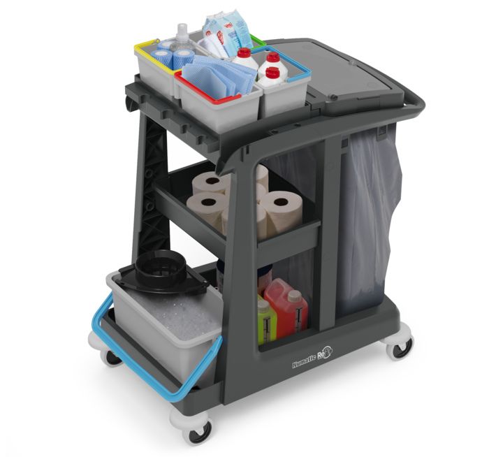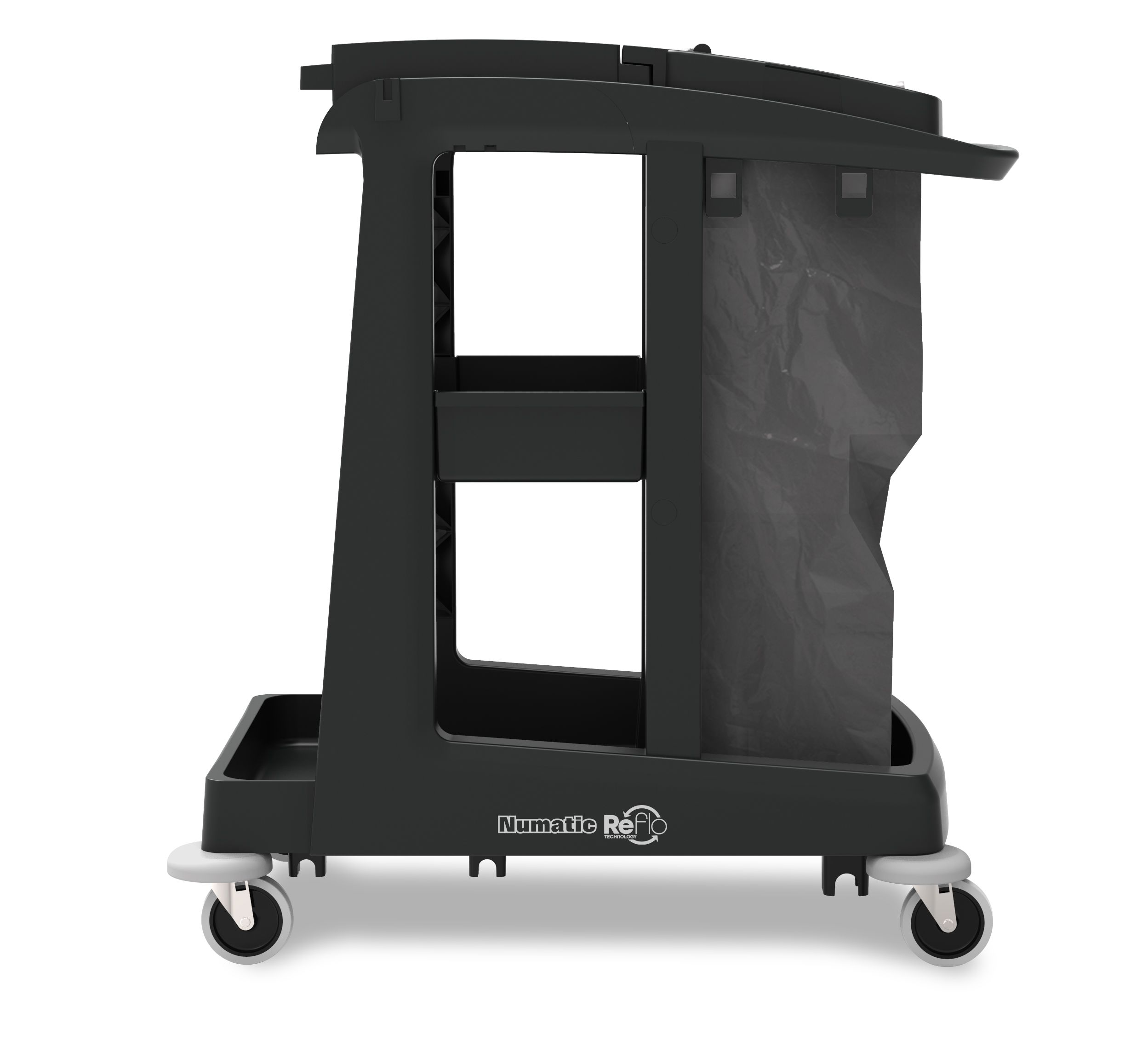 Le ECO-Matic EM1 est petit, compact et maniable. Ce chariot a un compartiment à déchets généreuse de 120 litres, un espace de rangement ouvert facile d’accès et un bac de rangement supérieur pour transporter tous les produits de nettoyage. Fabriquée à partir de plastique recyclé. Capacité (seaux) 2 x 10 litres. Dimensions 545 x 900 x 1000 mm.