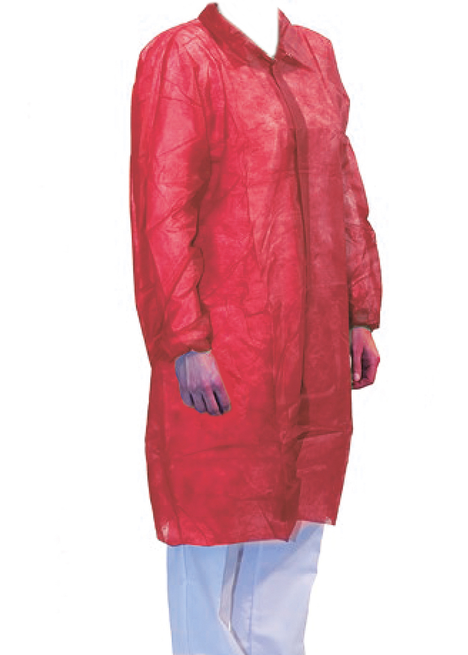 Manteau visiteur sans poches avec velcro, facile à mettre. Poignets avec élastiques qui se ferment bien. Convient pour une utilisation dans l’industrie alimentaire et le secteur médical. Taille: XXXL. Couleur: Rouge - 50x1 st/omdoos.