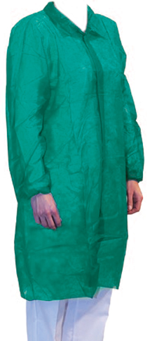 Manteau visiteur sans poches avec velcro, facile à mettre. Poignets avec élastiques qui se ferment bien. Convient pour une utilisation dans l’industrie alimentaire et le secteur médical. Taille: XXXL. Couleur: Vert - 5x10 pcs/boîte.