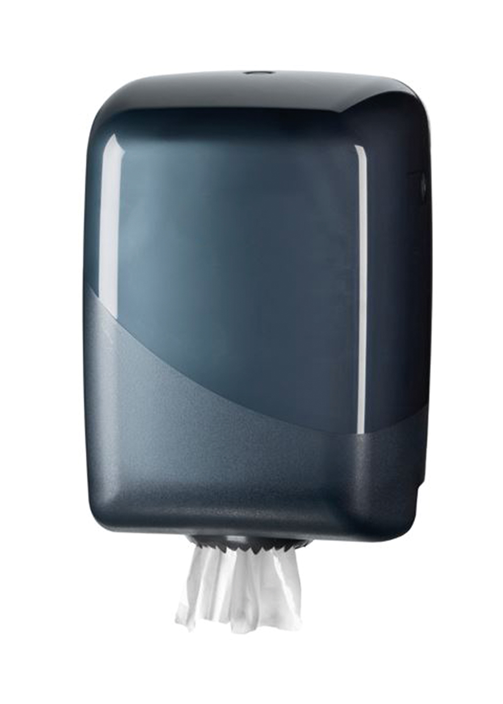 Centerfeed midi roll dispenser. Compact en ruimtebesparend. Semi transparant in kunststof zwart, per stuk. 345 x 180 x 72mm.