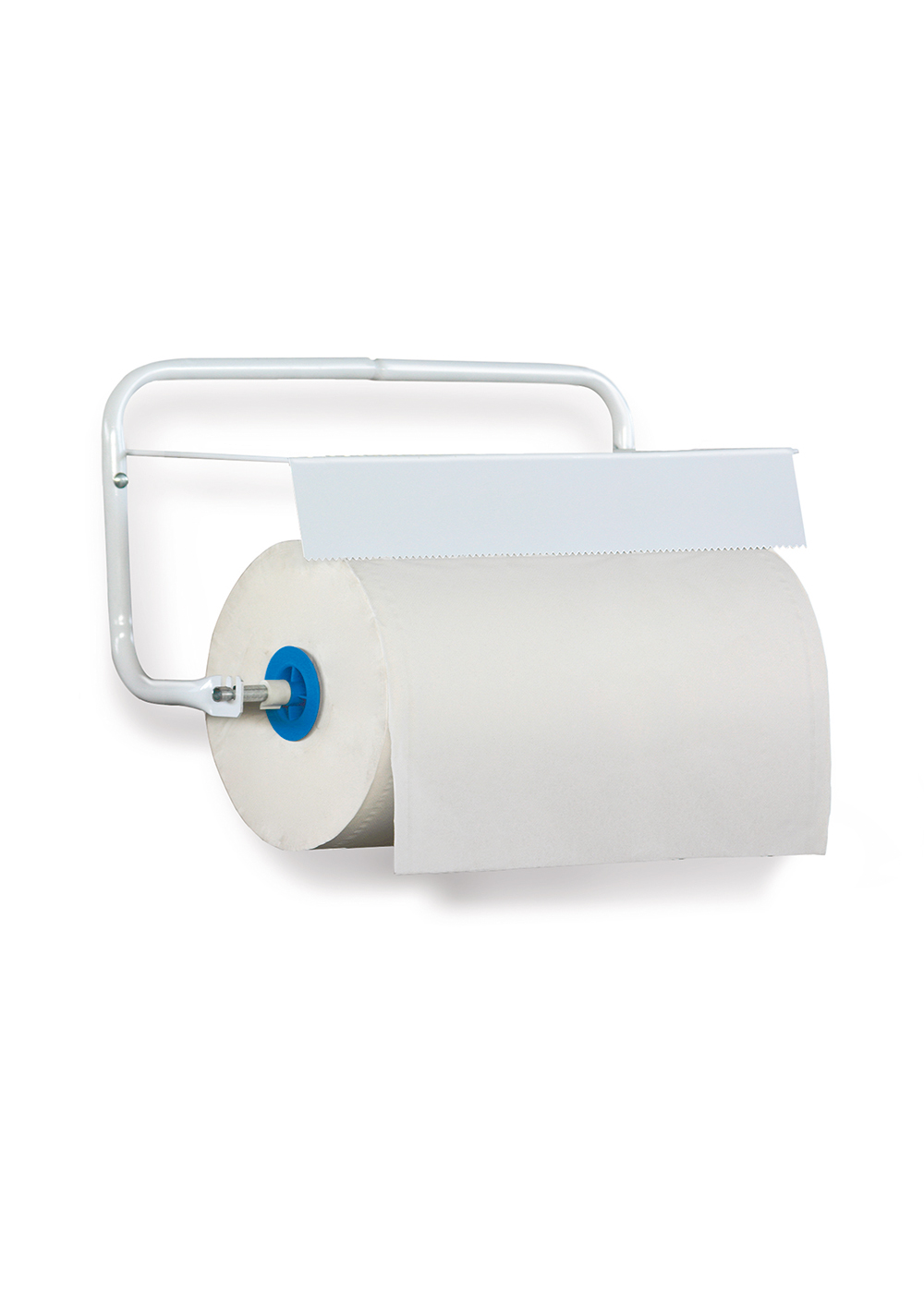 Industriële roldispenser - wall support. De rolpapierhouder is robuust gemaakt voor verschillende papier diameters. Met een mes voor het eenvoudig snijden van papier.