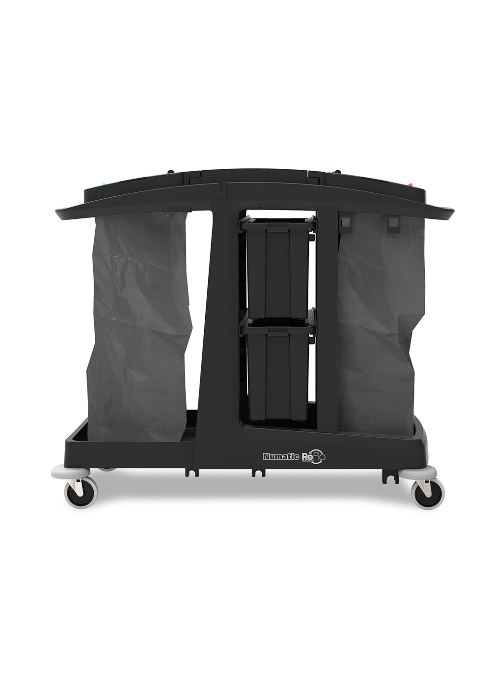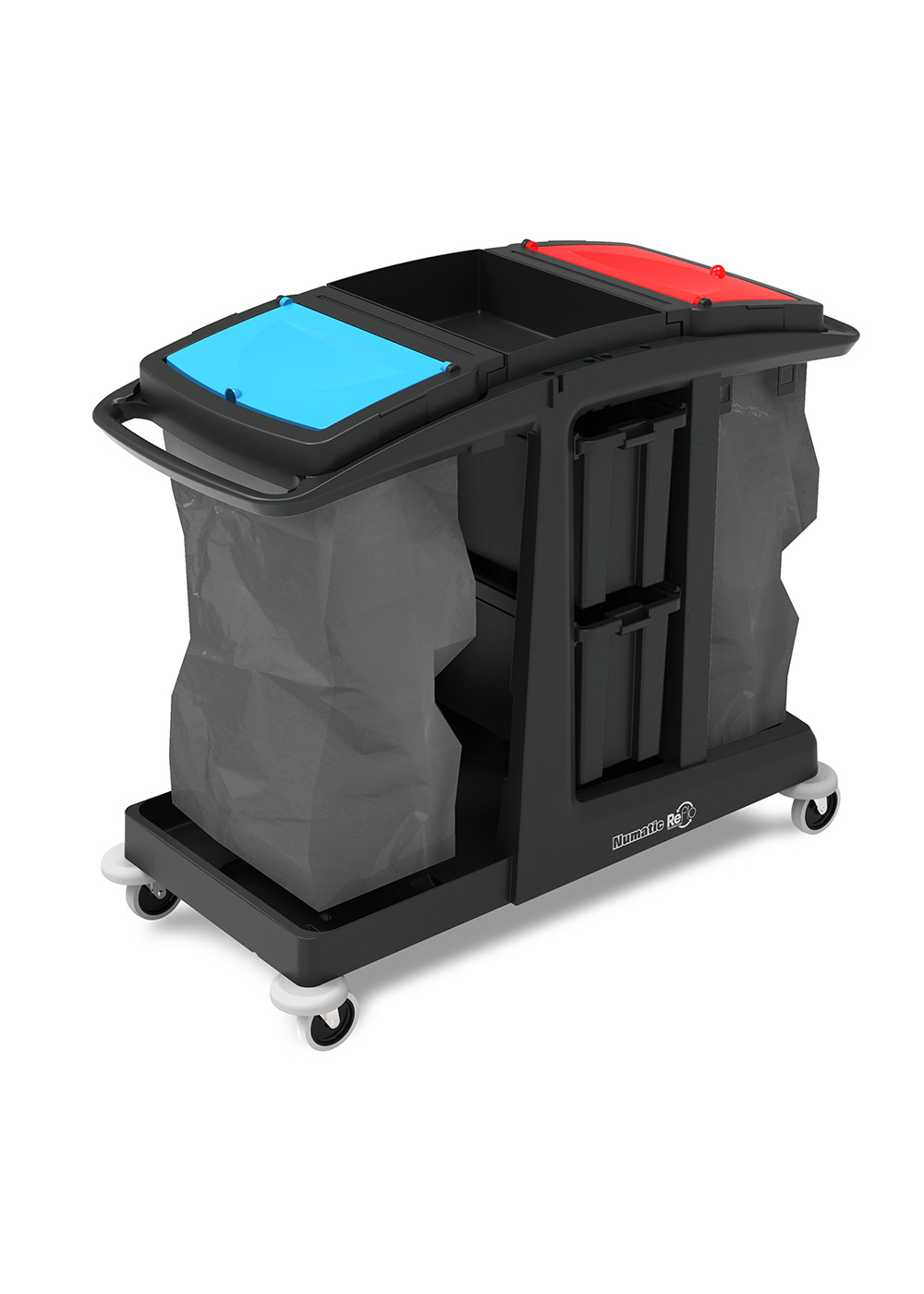 De ECO-Matic EM6 is voorzien van een maximale opslagcapaciteit van 2 x 120L voor vuilverzameling. De afsluitbare opbergruimte in de midden trays en de open top tray bieden ruimte voor al uw schoonmaakmiddelen en materialen. Afmetingen 545 x 1230 x 1000 mm.