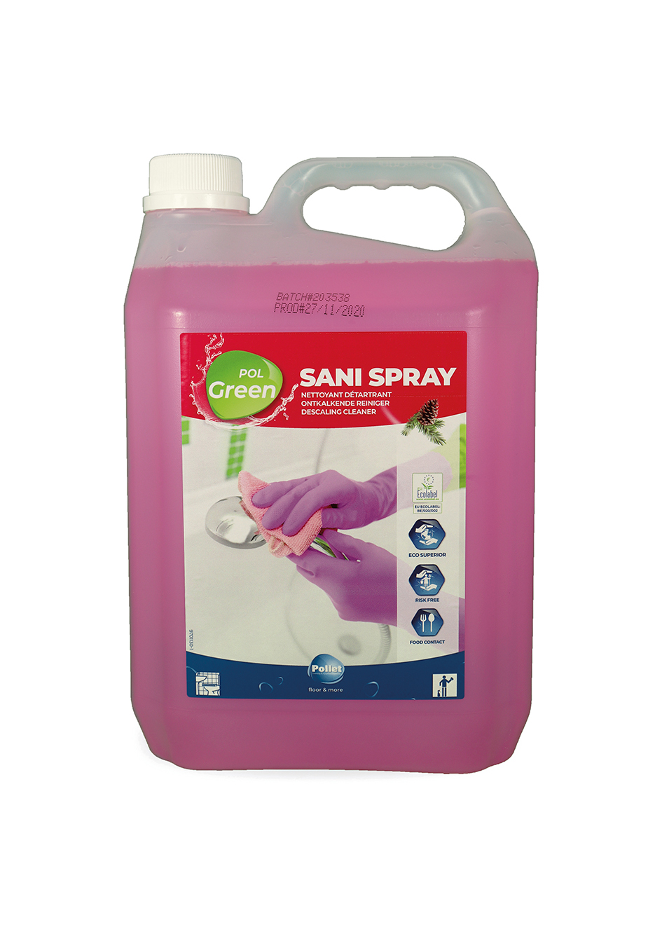 Sani Spray is een krachtige ecologische ontkalkende sanitairreiniger. Voor dagelijkse schoonmaak en onderhoud van sanitair. Het is niet allergeen en verspreidt een frisse dennenparfum. Overschrijdt de bindende blootstellingslimieten niet (EUR, FR, BE). Bioafbreekbaar product. Verpakking 100% recycleerbaar.
