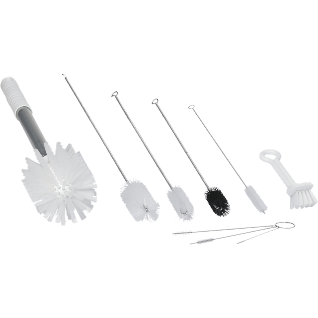 Vikan set sundae borstels, wit. Deze borstelset is ontworpen voor het effectief reiningen van softijsmachines en soorgelijke apparatuur en bevat een assortiment buisreiningers in verschillende diamters.